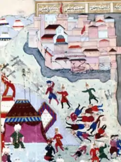 ![]() Зображення висадки на Кіпр османських військ і облоги Нікосії. Voyages et aventures de Ch. Magius, miniature no. 13. 1578 | |||