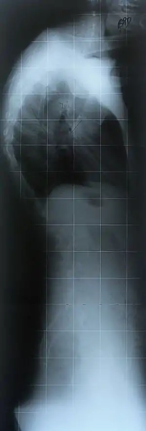 ![]() На рентгенівському знімку виразно видно кіфотичне викривлення хребта при хвороби Шоєрмана-Мау На рентгенівському знімку виразно видно кіфотичне викривлення хребта при хвороби Шоєрмана-Мау | |