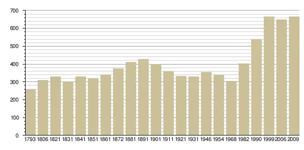 Динаміка населення (base Cassini de l'EHESS pour les nombres retenus jusque 1962[3], base Insee à partir de 1968 (population sans doubles comptes puis population municipale à partir de 2006)[4] · [5] ):
