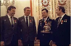 ![]() Космонавти (зліва направо) Олександр Лавейкін, Анатолій Левченко, Юрій Романенко, Олександр Александров після нагородження в Кремлі, 18 січня 1988 | |