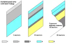 1 — пухкий новий сніг із залишків сніжинок; 2 — дрібнозернистий; 3 — глибинне замерзання; 4 — середньозернистий; 5 — великозернистий