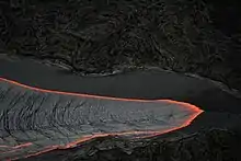 2. Форма залягання лави, що вилилася з вулкана, яка характеризується значною довжиною і невеликою шириною. Потоки кислих лав звичайно короткі (1-10 км) і потужні, базальтових — довгі (до 60-80 км) і незначні за потужністю.