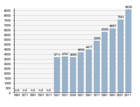 Станом на 31 грудня 2014 року в муніципалітеті офіційно проживало 899 іноземців з 55 країн, серед них 219 громадян країн Євросоюзу та 37 громадян України.[4]