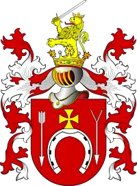 Герб має в червоному полі зображення срібної підкови рогами вниз, на ній золотий кавалерський хрест, з боків срібні стріли наконечними вниз. Клейнод — над верхом корони половина коронованого лева з мечем в правій лапі.