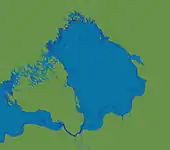 Ладозьке озеро як частина Анцилового озера (між 9300 і 9200 років тому). Зелена лінія - положення південної берегової лінії Ладозького озера під час існування Іольдійового моря.