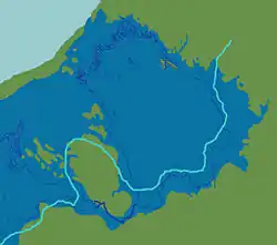 Берегова лінія Ладозького озера в період максимуму Ладозької трансгресії перед появою Неви (між 4500 і 2500 років тому). Показані долини річок Мга та Тосна і вододіл між ними.