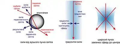 Використовуючи просту діаграму променів і розглядачючи напрямки імпульсів відбитих і заломлених променів, можна помітити, що на мікросферу діють дві різні оптичні сили. Як видно з діаграми, результуюча сила тягне сферу у напрямку області найвищої інтенсивності променя. Ця сила називається градієнтною. Крім того, на сферу діє світловий тиск, штовхаючи її в напрямку падіння променя.