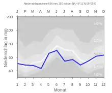 Річна кількість опадів становить 667 міліметрів. Опади складають середню третину значень, зафіксованих у Німеччині. Нижчі значення зареєстровані на 33 відсотках вимірювальних станцій Німецької метеорологічної служби. Найсухіший місяць — квітень, найбільше опадів — у червні. У червні випадає в 1,6 рази більше опадів, ніж у квітні. Опади змінюються лише мінімально і надзвичайно рівномірно розподіляються протягом року. Менші сезонні коливання фіксуються лише на 5 відсотках вимірювальних станцій.