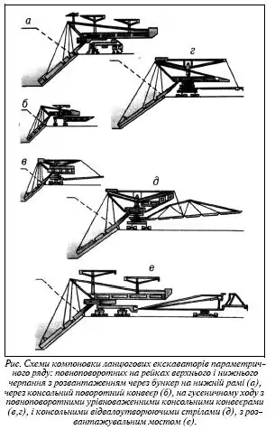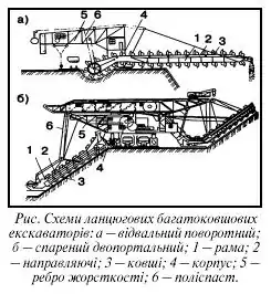 Порода з ковшів, які огинають тягові зірки, висипається або на приймальний стіл, який обертається, або на перевантажувальний конвеєр, які передають її в бункер або на відвальний конвеєр. Ківшева рама і відвальна стріла підвішуються, як правило, до металоконструкцій, які мають індивідуальні консолі противаг.