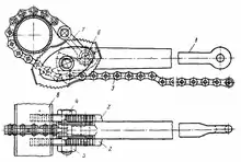 Складається (рис. ) з двох щік 2 із зубами, ланцюга 3 із плоскими шарнірними ланками і рукоятки 1. Щока і рукоятка з'єднані болтом, який проходить через середину щік , 4 і гайку 5. Один кінець ланцюга приєднаний до рукоятки за допомогою пальця 6 і початкової ланки 7. Палець 6 входить у відповідні отвори в щоках. Щока термічно оброблена. При установці ключа на трубу 8 зуби щік щільно обхоплюють трубу і служать опорою для рукоятки. Натискаючи на рукоятку, можна нагвинчувати або відгвинчувати трубу. При зносі зубців щоки повертають і в роботу включаються зубці незношеного сектора.