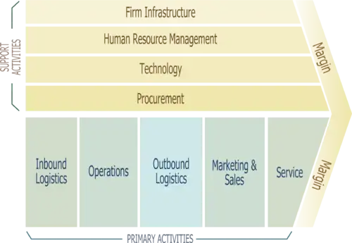 Компанії можуть використовувати конкурентні переваги в будь-якому з п'яти видів діяльності в ланцюзі вартості. Наприклад, створюючи високоефективну вихідну логістику або зменшуючи витрати на доставку компанії, це дозволяє або отримати більший прибуток, або передати заощадження споживачеві за нижчих цін.[7]