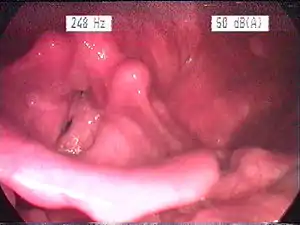 ![]() Ендоскопічна картина запалення гортані внаслідок кислотного рефлюксу Ендоскопічна картина запалення гортані внаслідок кислотного рефлюксу | |