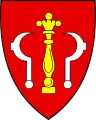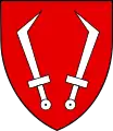 Powinny być dwa lemięsze, końcami do góry, i ostrzem na bok obrócone, w czerwonym polu, na hełmie trzy pióra strusie[3].