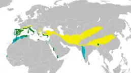 ![]() Гніздовий (жовтий), цілорічний (зелений) та негніздовий (блакитний) ареали | ||||||||||||||||