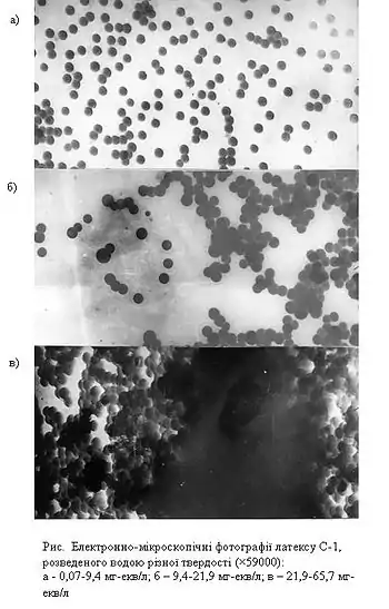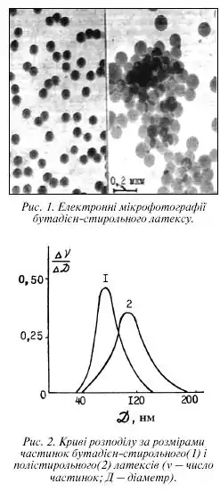 Форма та розміри частинок латексів тісно пов'язані з закономірностями процесу емульсійної полімеризації вихідних мономерів. Частинки синтетичних латексів найчастіше мають сферичну або близьку до неї форму. Латексні ґлобули стабілізовані йоногенною поверхнево-активною речовиною частіше аніонного типу. На рис. 1 наведено типові електронні мікрофотографії латексів, що містять первинні сферичні частинки-ґлобули та їх агрегати. Спонтанно в плині часу або у зв'язку з тією чи іншою обробкою (кислотно-лужною, гідродинамічною, температурною та під дією ін. впливів) в латексній дисперсії утворюються вторинні агрегати, що нагадують грона. Первинні ґлобули в таких «гронах» злиплися, але їх коалесценція не відбулася. У більшій частині випадків латекси не є монодисперсними і характеризуються тим чи іншим ступенем полідисперсності, яка, в свою чергу, залежить від умов протікання полімеризаційного процесу. На рис. 2. наведено криві розподілу розмірів частинок деяких синтетичних латексів. Як правило, діаметр первинних латексних ґлобул становить 10-200 нм. В різних галузях промисловості широко застосовуються ізопренові, бутадієнові, бутадієн-стирольні, бутадієн-метилстирольні, хлоропренові, ізобутилен-ізопренові, карбоксилатні, акрилові, уретанові та інші латекс