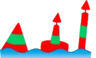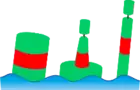 - ліва сторона позначається знаками зеленого кольору і зеленими проблисковими вогнями будь-якого ритму блимання, окрім 2+1