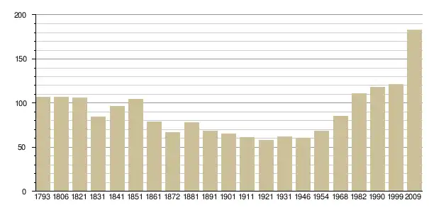 - Insee : historique des populations par commune depuis le recensement de 1962, наведено за французькою вікіпедією