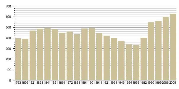 Динаміка населення (base Cassini de l'EHESS pour les nombres retenus jusque 1962[3], base Insee à partir de 1968 (population sans doubles comptes puis population municipale à partir de 2006)[4] · [5] ):