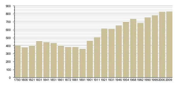 Динаміка населення (base Cassini de l'EHESS pour les nombres retenus jusque 1962[3], base Insee à partir de 1968 (population sans doubles comptes puis population municipale à partir de 2006)[4] · [5] ):