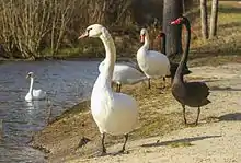 - Лебідь-шипун (Cygnus olor) -має таку назву через характерні шиплячі звуки,які представники цього виду видають коли не задоволені чи роздратовані.Служить символом Данії[16].Це велика порода,особини можуть важити до 13 кілограм(трапляються масою 15кг), самки переважно мають меншу масу тіла (6-9 кілограм).Колір опереня -білий,у молодих особин віком до трьох років оперення буре,дзьоб -червоний із характерним цьому виду наростом. На відміну від інших порід,під час плавання лебідь шипун тримає шию зігнотою у формі латинської літери "S".Тривалість життя може тривати до 28 років.[17] У Великобританії лебеді-шипуни, що плавають на річці Темзі належать королеві та їх вилов суворо заборонений[18]. Гніздо лебедя це пожовкла рослинність,яку зберає переважно самка. Кладка складає 5-8 яєць брудно-жовтого кольору, які насиджує переважно також самка. Населяють переважно водойми із зарослою водою (лимани,озера, іноді болота[19]).