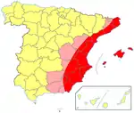 У широкому сенсі слова означена територія охоплює такі автономні співтовариства: Валенсія (Аліканте, Кастельйон і Валенсія), Мурсія, Каталонія (Барселова, Жирона, Таррагона), східна частина Кастилії — Ла-Манчі (Альбасете і Куенка), східну частину Андалусії (Альмерія, Гранада, Хаен), південну частину Арагона (Теруель і Балеарські острови).