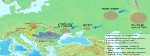 Заселення угорцями Леведію могло відбутися протягом VIII століття.[6] Перш на цій території кочували тюркомовні булгари і зберігалося аланське землеробське населення, причому територія на захід від Дніпра визнавала владу хана дунайських болгар Крума, а на схід — хазарського.
