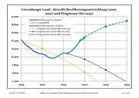 Динаміка населення з 1875 року в сучасних кордонах (Синя лінія: населення; Пунктир: відносна порівняльна динаміка населення землі Бранденбург; Сірий фон: період Третього рейху; Помаранчевий фон: період НДР)