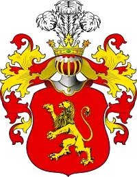 Опис гербу — використання принципів блазонування, запропонованого Альфредом Знамеровським (пол. Alfred Znamierowski): У червонім полі невтримний лев із золота. У клейноді над шоломом в короні три пера страуса. І обабіч щита лаври червоні прикрашені золотом.
