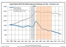 Динаміка населення з 1875 року в сучасних кордонах (Синя лінія: населення; Пунктир: відносна порівняльна динаміка населення землі Бранденбург; Сірий фон: період Третього рейху; Помаранчевий фон: період НДР)