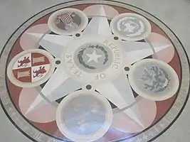 Герби шести державних утворень, в складі яких побував Техас за свою історію: Іспанія, Франція, Мексика, незалежний Техас, Конфедерація та США