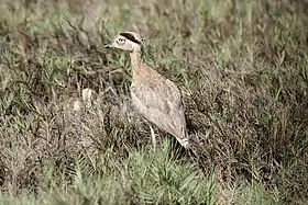 Птах завдовжки до 40 см. Забарвлення оперення плямисте, сіро-коричневе. Черево біле. На голові є широка біла надбрівна смуга, а над нею чорна смуга. Дзьоб короткий, міцний з чорним кінчиком.