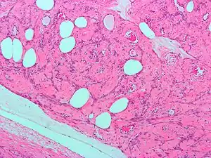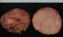 ![]() Мікрофотознімок лейоміоми матки (фарбування г-е). Мікрофотознімок лейоміоми матки (фарбування г-е). | |