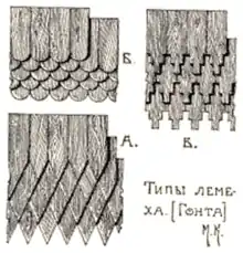 Колоди рубали сокирою, оскільки при поперечному рубанні деревини її пори забиваються і стають недоступними для вологи[7]. Переважно використовували осику — завдяки її податливості при обробці, збільшенню міцності пізніше під впливом дощу і снігу, і набуваному з часом сріблястому відливу[8]. Вузький осиковий (чи дубовий, кленовий)[7] тес розрубували на дрібні дощечки, кінці яких загострювали у вигляді ступінчастого клина (городчастий) або півкругом (Лампожненська церква в Архангельській області)[9], або трикутним завершенням[10]. Профіль лемеша має опуклу форму (по поверхні), що значно ускладнює його виготовлення і підвищує вимоги до якості деревини. Довжина одного елемента — до 50 см. Прибиваються рядами, внапусток.