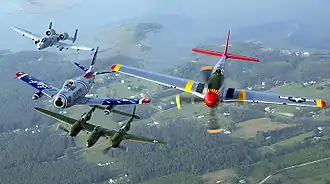 Бойові літаки різних поколінь військової авіації: A-10 Thunderbolt II, F-86 Sabre, P-38 Lightning та P-51 Mustang — здійснюють політ на авіашоу на авіабазу у Ленглі, Вірджинія. 26 травня 2004