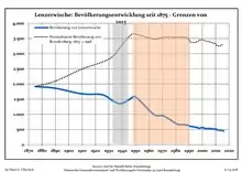 Динаміка населення з 1875 року в сучасних кордонах (Синя лінія: населення; Пунктир: відносна порівняльна динаміка населення землі Бранденбург; Сірий фон: період Третього рейху; Помаранчевий фон: період НДР)
