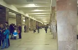 Оздоблення частково перегукується з Мавзолеєм Леніна. Розширюються догори колони пероні в залі облицьовані червоним карельським гранітом . В оздобленні колійних стін використано неполірований білий мармур.