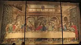Килим «Таємна вечеря» з використнням композиції Леонардо з відомої фрески монастиря у Мілані та суттєвими змінами на тлі, Ватиканська пінакотека, Рим
