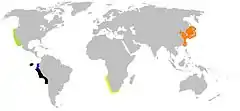 Мешкають біля південної Африки (ПАР, Намібія, Ангола), на Далекому Сході (Японія, Китай, Тайвань, Корейський півострів, Росія), уздовж узбережжя Каліфорнійського півострова (США, Мексика) та Еквадору й Перу (Південна Америка).