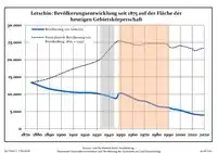 Динаміка населення з 1875 року в сучасних кордонах (Синя лінія: населення; Пунктир: відносна порівняльна динаміка населення землі Бранденбург; Сірий фон: період Третього рейху; Помаранчевий фон: період НДР)