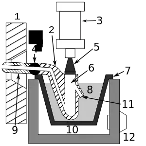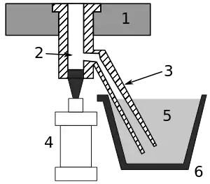 За допомогою мірного ковша розплав заливають у камеру стискання, звідки пресувальний поршень витісняє його в робочу порожнину форми. Тут розплав остигає і потім при розкритті форми виливок автоматично видаляється з форми. Для підтримки температури форми на певному рівні (попередження перегрівання) у формі передбачено охолодження водою за допомогою спеціальних каналів.