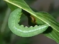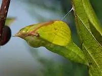 Харчується листями крушини (жостера). Самка відкладає яйця одне за одним поряд з соковитими пагонами, щоб гусениці, які вилупляться з яєць, мали достатню кількість корму. Матово-жовті гусениці зазвичай спочатку вигризають отвір в листовій пластинці, потім переповзають на край листа і поступово з'їдають весь лист, залишаючи тільки тверді жилки.