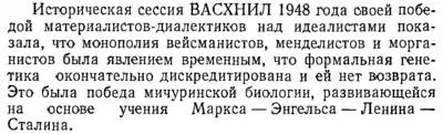 «Вчення діалектичного матеріалізму про взаємозалежності і взаємозумовленості, про безперервний рух і зміни в природі, де завжди щось виникає і розвивається, щось відживає і руйнується, озброїло ідейно Мічуріна і Лисенка і дало їм можливість вийти переможцями з боротьби з метафізиками і ідеалістами, з послідовниками Вейсмана, Менделя і Моргана».