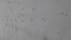 Біжить лисиця прямою лінією, залишаючи за собою чіткий ланцюжок слідів. Налякана тварина може бігти дуже швидко, галопом або майже розпластується над землею, далеко витягнувши хвіст.