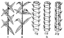 Листкорозмі́щення — порядок розташування листків на стеблах, що відображує симетрію в будові пагона. Розрізняють: 1) спіральне, або чергове, листкорозміщення, при якому від кожного стеблового вузла відходить один листок (властиве більшості рослин); 2) супротивне листкорозміщення — у кожному вузлі сидять один проти одного два листки, при цьому взаємно перпендикулярно (у губоцвітих, бузку); 3) кільчасте листкорозміщення — від кожного вузла відходять три і більше листків (наприклад, у воронячого ока, елодії). Вертикальні лінії, які умовно можна провести через основи листків, що сидять один над одним, наз. ортостихами; спіральна лінія, умовно проведена через основи всіх листків, розташованих у проміжку між двома листками однієї ортостихи, наз. основною, або генетичною, спіраллю; сукупність листків на цій спіралі — листковим циклом, а кут між двома листками на горизонтальній проекції листкового циклу — кутом розходження. Спіральне листкорозміщення виражають математично у вигляді дробу, чисельник якого — число обертів осн. спіралі в листковому циклі, а знаменник — кількість листків у ньому або число ортостих на стеблі.