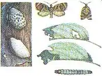Розмах крил метелика: самки — 26-27 міліметрів, самця — 19-21 мміліметри. Передні крила від коричневого до коричнево-сірого кольору. У самки широка буро-коричнева перев'язь на передніх крилах, у самця плями оксамитові, темно-коричневі. Середня перев'язь не доходить до переднього краю крила. Задні крила світло-коричневі. Відкладають купками яйця жовтого кольору. Яйцекладка вкрита зверху цементуючою воскоподібною речовиною, і нагадує грудочку вапна розміром 0,3х0,8 сантиметри. Забарвлення гусениць від світло-сірого до сірувато-зеленого і, нарешті, оксамитово-чорного. Голова, грудний і анальний щитки блискучо-чорні. Довжина гусениці 20-25 мм. Лялечки завдовжки 15-16 міліметрів у самок і 11-12 міліметрів у самців, колір їх матово-чорний. На передньому краї першого черевного сегмента є горби, кінець черевця дуже витягнутий і має вісім гачечків.