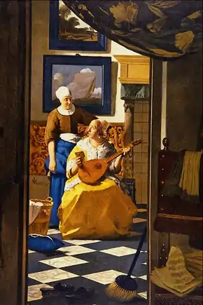 Щоб підсилити виразність твору, Ян Вермер ужив засобу звуження. Подія картини відбувається в щільному просторі, обмеженому порталом сусідньої кімнати, що через неї персонажі спостерігають художник і глядач. Ми бачимо праворуч стілець з нотами, а за отвором порталу — кілька побутових речей: деркач для підлоги, стоптані домашні черевики, кошик з білизною. Тільки опісля погляд доходить до персонажів картини.