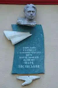 Меморіальна дошка на згадку про Марка Лисянського встановлена під вікнами квартири поета за адресою Москва, вул. Черняховського, будинок 4 — ЖБК «Московський письменник».