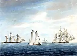 Маия 3-е (1794) Получивши от Адмиралтейств коллегии назначение служить на екскадре, отправляющейся в Северную Америку волантиром, оставил Лондон и прибыл в Портсмут на другой день. Адмирал Море, командующей екскадрою, на которой мне должно служить, принял меня весьма ласково и назначил на фрегат „Люазо“ под команду капитану Море, на которой я и перебрался со всем своим екипажем 6-го числа. Мне приятно было видеть всю нашу екскадру вместе, совершенно изготовленную к дальному походу, а тем паче, как столь славно окупированных кораблей я прежде не видал. Она состояла из 74 х пушечнаго „Резолюшена“ и 64х пушечнаго „Африки“, фрегатов „Титоса“, „Люазо“, „Клеопадры“, „Тизби“ и военного шлюпа „Линкса“.[8]
