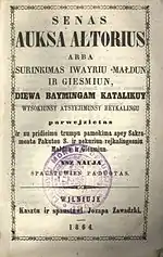 Найраніша писемна пам'ятка литовської мови датується 1503 роком. Це молитва («Аве Марія» та «Нікейський символ віри»), написана від руки на останній сторінці випущеної в Страсбурзі книги «Tractatus sacerdotalis». Текст дотримується дзукійського діалекту і, очевидно, списаний з ранішого оригіналу.[28] Немає сумнівів у тому, що церковні литовські тексти писалися і раніше, можливо навіть, у кінці XIV століття, адже запроваджене 1387 року в Аукштайтії християнство потребувало таких текстів для релігійної практики (в історичних джерелах згадується, що перші церковні тексти литовською переклав сам Ягайло).