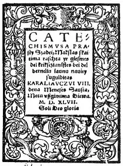 Друкарство починається 1547 року з катехизису Мартінаса Мажвідаса, написаному центральним варіантом літературної литовської мови[37] (за іншими даними — на західному варіанті литовської мови[38]) і виданому в Кенігсберзі. Книга містить перший литовський підручник — «Легка й швидка наука читання й письма», в якому автор на 4 сторінках наводить алфавіт і кілька придуманих ним граматичних термінів. Першою книгою, виданою на території Великого князівства Литовського, є католицький катехизис Мікалоюса Дауши, виданий 1595 року у Вільні[39] й написаний центральним варіантом літературної литовської мови, він також є першою книгою литовською мовою з зазначенням наголосу в словах тексту[38].